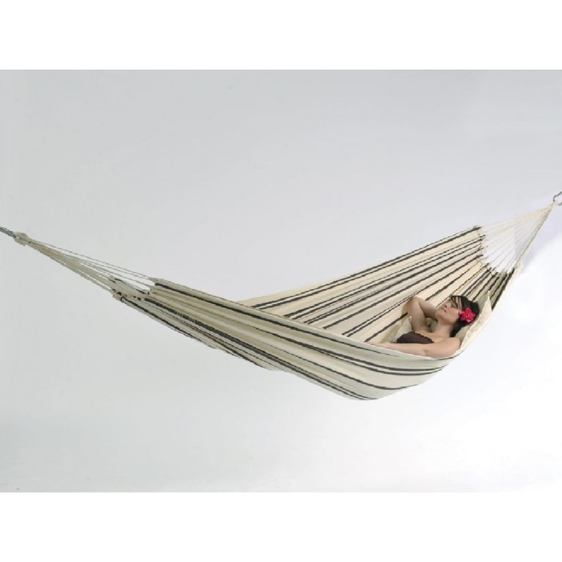 Z Brazylii, ojczyzny sjesty i celebrowania wypoczynku, pochodzi ten cudowny hamak. Jest bardzo duży i wygodny, dzięki maksymalnemu obciążeniu jest w stanie pomieścić więcej niż jedną dorosłą osobę! Charakteryzuje się wysoką jakością: zawartość bawełny 85%, poliestru: 15%, przez co jest niezwykle miły i komfortowy.